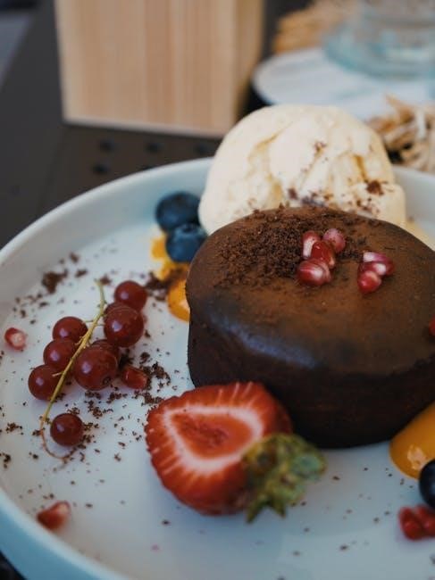 Quality ingredients and precise measurements are crucial for perfect ice cream. Common components include heavy cream, whole milk, sugar, and flavorings like vanilla or cocoa. Accurate ratios ensure optimal texture. Add-ins like fruits or nuts enhance flavor but require careful portioning to maintain consistency. Always measure ingredients before starting to avoid errors during the churning process. Proper balance prevents ice crystals and ensures creaminess. Refer to the recipe guide for specific proportions tailored to your Rival Ice Cream Maker. Adjustments may be needed based on mix-ins or dietary preferences. Measuring cups and spoons are essential tools for accuracy. Fresh ingredients yield the best results, so prioritize quality when selecting your supplies. Experiment with flavors while maintaining the foundational ratios for success. Keep track of measurements to refine recipes over time. A digital scale can be helpful for precise quantification. Always store ingredients properly before use to maintain freshness and safety. The right combination of ingredients and measurements ensures your ice cream turns out creamy, flavorful, and enjoyable every time. Regularly check expiration dates to avoid using spoiled ingredients, which can affect taste and texture. Understanding how ingredients interact is key to mastering ice cream making. Start with classic recipes before exploring more complex or unique flavor combinations. The churning process relies on correct ingredient ratios to aerate and freeze the mixture evenly. Proper measurements also prevent overloading the machine, ensuring smooth operation. Balancing sweetness and flavor is essential for a well-rounded taste. Adjust sweetness based on add-ins, as some ingredients naturally sweeten the mixture. Acidic ingredients like citrus may require adjustments in sweetener amounts to balance flavors. The type of sugar used can impact texture, with some providing better stability than others. Experimenting with alternative sweeteners is possible but may require recipe adjustments. Always dissolve sugars fully in liquids before chilling to ensure even distribution. Avoid overmixing, as it can incorporate too much air, leading to an icy texture. The ratio of cream to milk affects the richness and hardness of the ice cream. Higher cream content results in a richer, creamier texture. Milk adds moisture and prevents the ice cream from becoming too dense. Skim milk can be used for lighter recipes, while whole milk enhances richness. Combining different types of milk, like almond or coconut, offers dairy-free options with unique flavors. The choice of flavorings should complement the base ingredients without overpowering them. Extracts like vanilla or almond can enhance sweetness without added sugars. Cocoa powder or melted chocolate adds depth to chocolate-based recipes. Fresh fruits should be pureed or chopped to distribute flavor evenly. Folding in mix-ins during the churning process ensures they are evenly incorporated. Overmixing can break down ingredients and alter texture; Always chill ingredients before churning, as this ensures better aeration and a smoother final product. Cold ingredients also help the machine operate efficiently, preventing overheating. Proper temperature control is vital for achieving the desired consistency. Churning at the correct temperature prevents ice crystals and ensures a creamy texture. Ingredients should be at refrigerator temperature, around 40°F, before adding to the machine. Avoid using overly warm ingredients, as they can increase the machine’s workload and affect results. Properly aged mixtures, like custard bases, develop better flavor and texture. Aging allows ingredients to meld and fats to stabilize, resulting in a smoother ice cream. Resting the mixture in the refrigerator for at least 2 hours is recommended. This step is especially important for custard-based ice creams, as it enhances flavor and reduces ice crystal formation. Always label and date mixtures stored in the freezer for later use. Portion control is essential when adding mix-ins, as too many can disrupt the churning process. Distribute mix-ins evenly to ensure every bite has consistent flavor. For layered or swirl effects, add ingredients toward the end of the churning cycle. This prevents over-incorporation and maintains distinct flavors. The machine’s capacity determines the maximum batch size, so avoid overfilling to ensure proper churning. Leave enough space for the mixture to expand during aeration. Overloading can lead to poor texture and machine strain. Always follow the manufacturer’s guidelines for ingredient quantities and types. Some ingredients may require special handling, like tempering eggs or melting chocolate. Tempering eggs prevents scrambling when adding hot or cold mixtures. Melted chocolate should be cooled slightly before incorporating to avoid seizing or graininess. Acidic ingredients like citrus juice may require adjustments in sweeteners or stabilizers. Stabilizers like guar gum or carrageenan can improve texture but should be used sparingly. Too many stabilizers can make the ice cream taste artificial or gummy. Natural stabilizers like egg yolks or gelatin are great alternatives for homemade recipes. They enhance richness and provide structure without artificial additives. When using alternative milks, adjust stabilizers as needed to achieve the desired texture. For vegan recipes, ingredients like coconut oil or tapioca starch can help mimic dairy’s properties. Always taste the mixture before churning to adjust sweetness or flavor. Small adjustments are easier to make before the ice cream is frozen. Keep a notebook to record recipe tweaks and preferences for future batches. Tracking your adjustments helps refine recipes and ensures consistent results. Don’t be afraid to experiment with unique ingredients, but start with small batches to test flavor combinations. This approach minimizes waste an