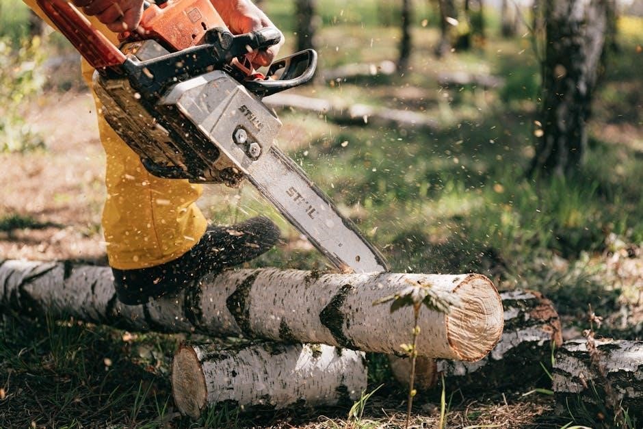 The manual explains how to adjust chain tension to prevent derailment and ensure smooth cutting. It also covers bar inspection, cleaning, and lubrication procedures, emphasizing the importance of maintaining the oiler system. Instructions detail how to check and clean the bar groove, and how to flip the bar periodically for even wear. Following these PDF instructions extends chain and bar life, reduces kickback risk, and optimizes cutting performance. Regular maintenance, guided by the manual, is key to chainsaw longevity.